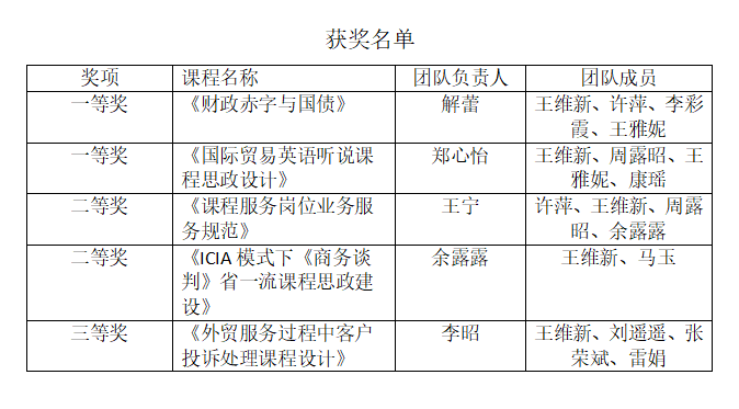 由中国国际贸易学会、全国外贸单证岗位技能大赛组委会主办的第三届“慧华”杯全国高校国际经贸类课程思政设计大赛于2023年12月圆满结束。经济与管理学院5位参赛教师报送《课程服务岗位业务服务规范》、《财政赤字与国债》等5门课程,最终取得了国家一等奖2项、二等奖2项、三等奖1项的优异成绩,为教师组学科竞赛再添新荣誉。