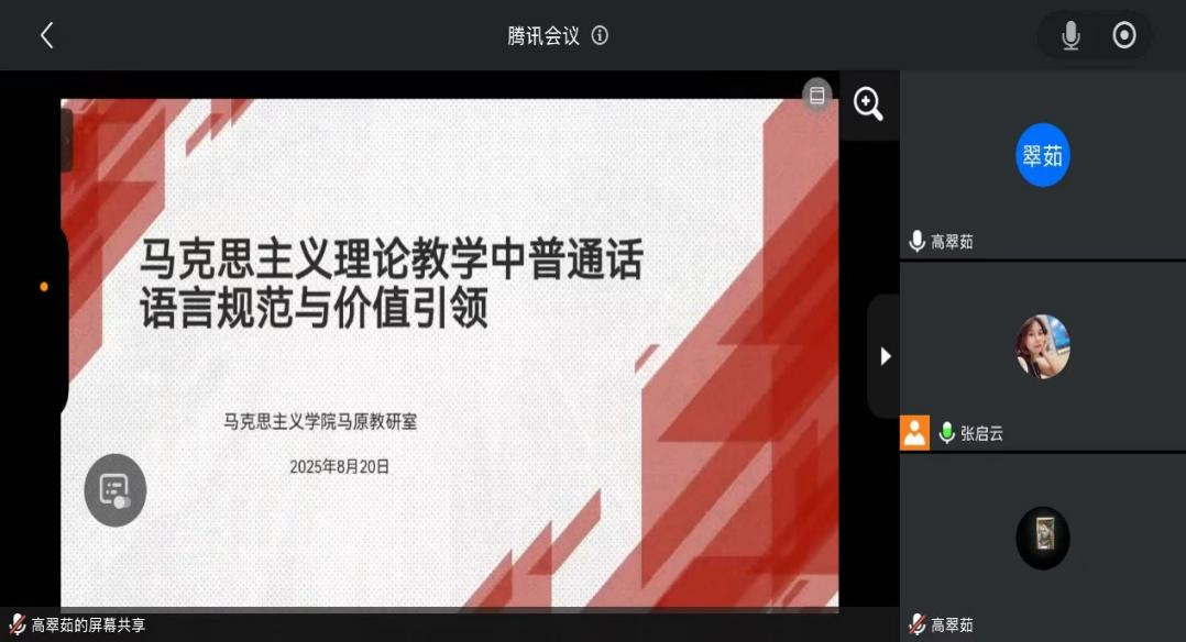 为强化思政课教学的语言规范性与思想传播力,8月20日晚上20点,马克思主义学院马克思主义基本原理教研室召开落实推广普通话专题会议。教研室全体教师参加,会议由教研室主任张启云主持。