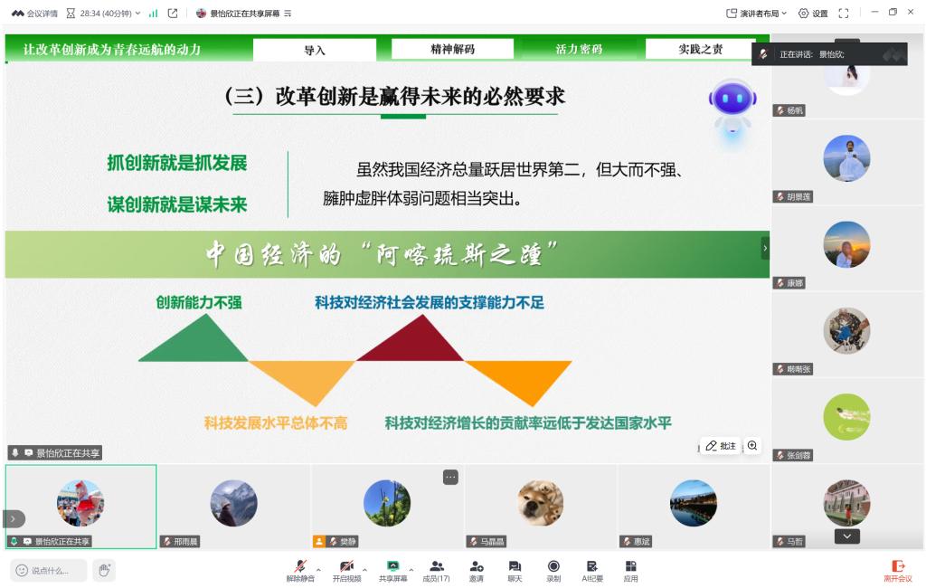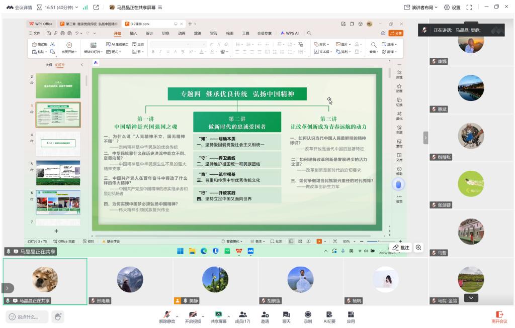 为深入贯彻落实党的二十届四中全会精神,进一步加强和改进新时代高校思想政治理论课教学,提升课程育人实效,10月26日晚上19:30,马克思主义学院《思想道德与法治》课程组全体教师在线上参加了集体备课会,会议由德育教研室主任樊静主持,本次备课会聚焦课程建设与发展,重点围绕教材第三章、第四章教学内容进行了深入研讨和交流。