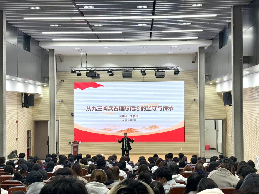 王传薇教授以九三阅兵的历史背景切入,结合自身思政教育研究经验,从“阅兵中的强国符号”“从强军到强国的征程脉络”“青年一代的使命坐标”三个维度展开讲授。她通过对比不同时期阅兵的装备变化、方阵风貌,展现了我国从“站起来”到“强起来”的发展跨越;同时结合自身参与法律咨询、思政教学的实践案例,鼓励青年学生将“强国梦”融入专业学习与日常行动,“把个人成长的‘小目标’融入到国家发展的‘大蓝图’里”。