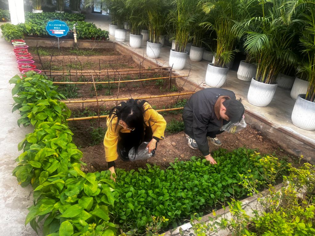 抵达基地后,养护工作同步在田间作物与盆栽绿植两类区域展开,老师指导学生们按照蔬菜品类仔细巡查蔬菜长势,清理杂草,并根据需求进行补水,各个环节有条不紊;同时老师也领着学生们聚焦基地内的盆栽绿植,开展浇水、状态巡查等日常照料,细致保障盆栽的生长条件。目前,基地内前期播种的蔬菜整体长势良好,其中菠菜和青菜已达到采摘标准,为此次实践活动奠定了收获的基础。