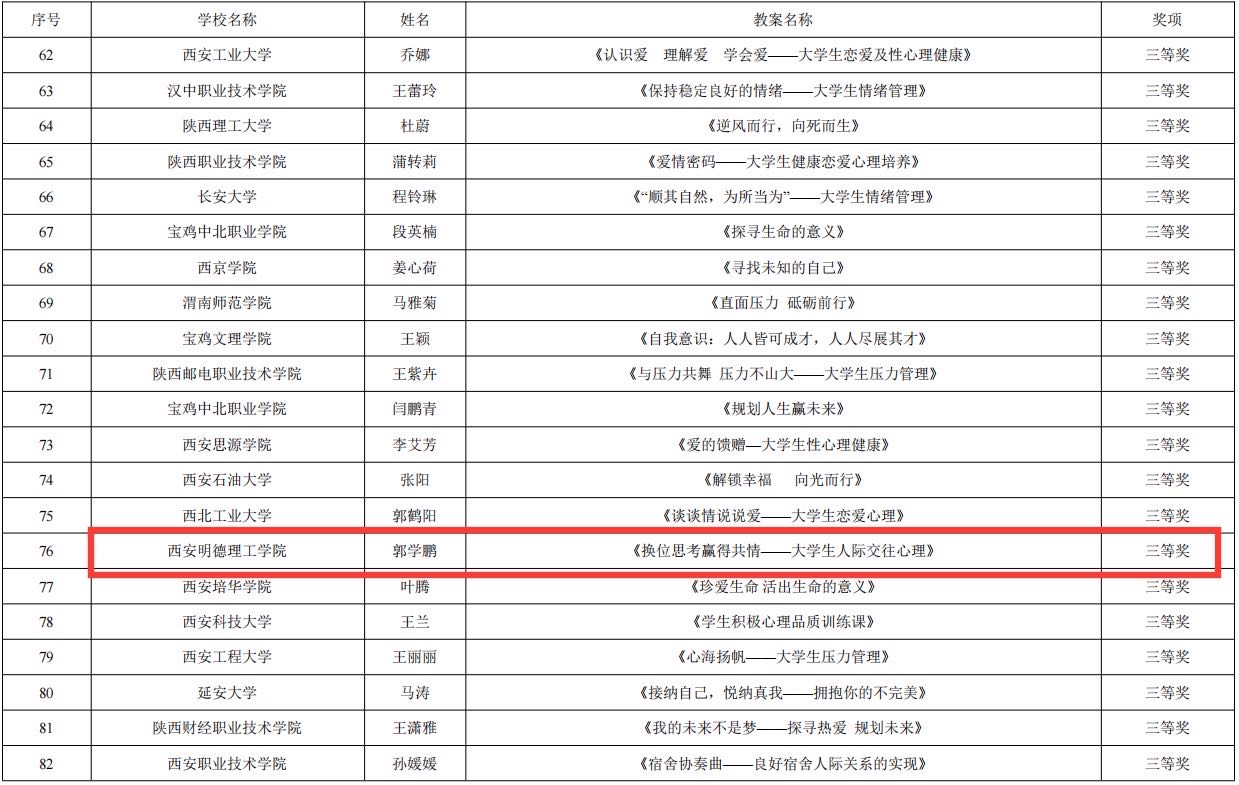 近日,在《中共陕西省委教育工委公布的陕西高校第八届“阳光护航”心理育人宣传季省级实践活动表现突出师生进行表扬的通知》中,我院大学生心理健康教育教研室三名教师受到通报表扬。本次活动从今年3月份起,经学院、学校推荐、专家评审、结果公示和委厅研究等程序,最终,我院专职心理健康教育教师王蕊的教案《做情绪的主人——情绪与心理健康》、兼职心理教师郭学鹏的教案《换位思考赢得共情——大学生人际交往心理》荣获第五届陕西高校心理健康优秀教案评选三等奖;由专职心理教师韩娇老师、国际教育学院辅导员康佳馨作为指导老师,国际教育学院孟浩生、陈硕、梁馨文三位同学作为参赛学生在第六届陕西高校大学生心理健康科普知识竞赛中荣获优秀奖。