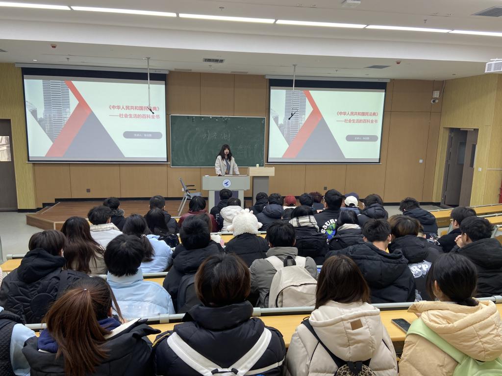 惠斌老师从刑法中的犯罪概念讲起,通过举案说法,把犯罪的四个构成要件给同学做了梳理;景怡欣老师带领同学们学习了关于《宪法》的相关知识;王婉菲老师、李文彬老师、马乾昱老师、马哲老师和张剑蓉老师分别为同学们解读了中《民法典》,使同学们对民法典的立法背景、亮点、要点和与大家息息相关的内容有了详细了解,并结合与大学生日常生活的现实案例进行民法典知识的普及,实现了民法典基本内容全覆盖;樊静老师为同学们解读了《中华人民共和国爱国主义教育法》,主要从立法经过、立法内容和立法意义三个方面进了宣传,通过爱国主义教育,有利于师生自觉传承和弘扬爱国主义精神。