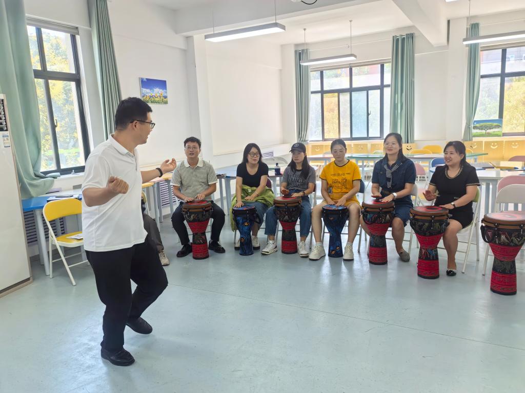 在实操环节,苏老师和郭老师通过现场演示和互动体验,带领老师们逐步掌握鼓圈活动的组织技巧与节奏引导方法。老师们积极参与,在鼓声与节拍中感受非言语沟通的魅力,体验音乐带来的身心整合与情绪流动。活动现场笑声不断,展现了鼓圈文化独特的感染力和互动性。