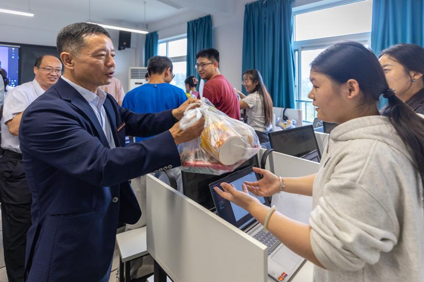 本次竞赛受到学校领导的高度重视。9月5日下午3点,校长王志刚、党委书记马川鑫、副校长林东、副校长刘星专程来到竞赛现场开展慰问工作,为大家送上水果等慰问品。在与学子的交流中,王志刚校长殷切嘱托,强调数学建模竞赛既是检验学生专业能力与协作精神的重要平台,更是学校落实竞赛育人理念的关键载体;提及本次竞赛题目贴近实际,学生在解题过程中可锻炼创新思维、提升解决复杂问题的能力,而这正是学校培养高素质人才的重要路径。同时,学校一直以参赛学子为傲,希望大家在后续竞赛中保持沉着冷静的心态,发挥团队协作优势,充分展现平时培训的积累——既要争取竞赛佳绩,也要在过程中收获成长,发扬“明德”精神,力争交出优秀答卷,为学校争光。