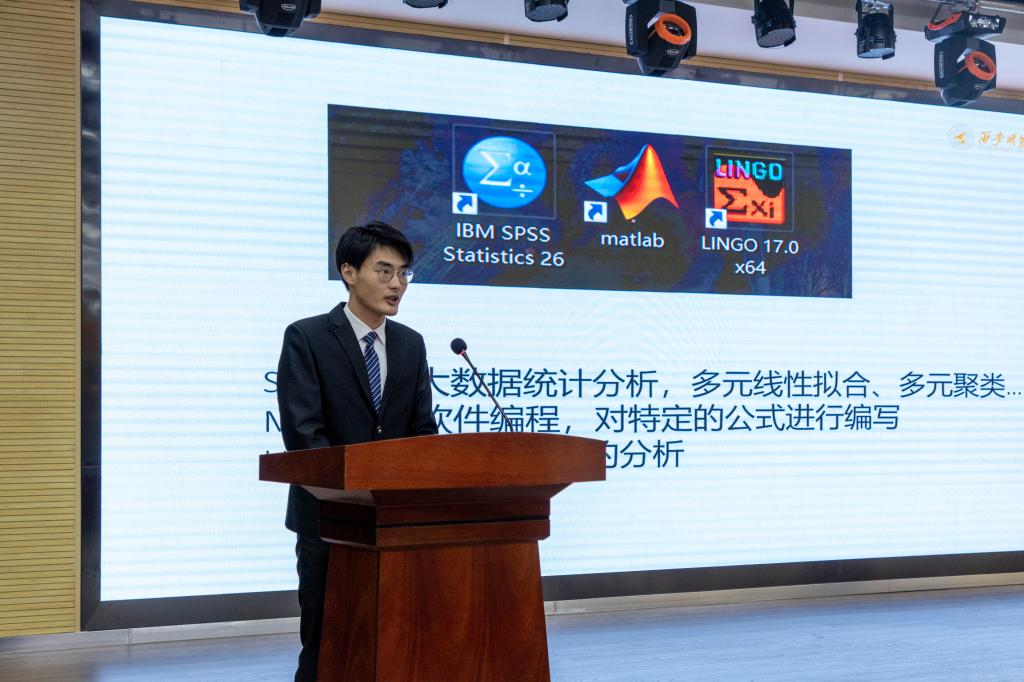 再次,赵浩钧、陈亚聪、林吉荣代表获奖同学进行了参赛经验分享,三位同学分别从日常学习、参赛心得、参赛收获等方面做了交流分享,还表示通过参加数学建模竞赛,不仅激发了自己的创造力,也大大提高了自己的自信心。