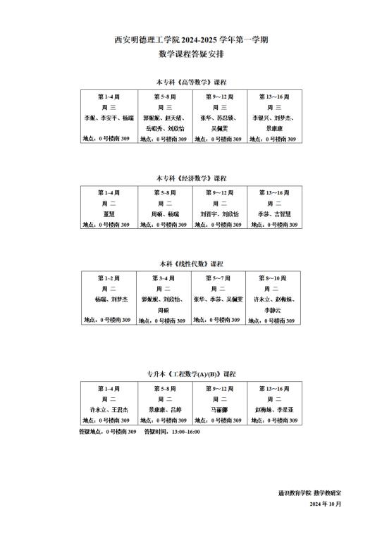 2024-2025学年第一学期数学答疑安排(1).pdf