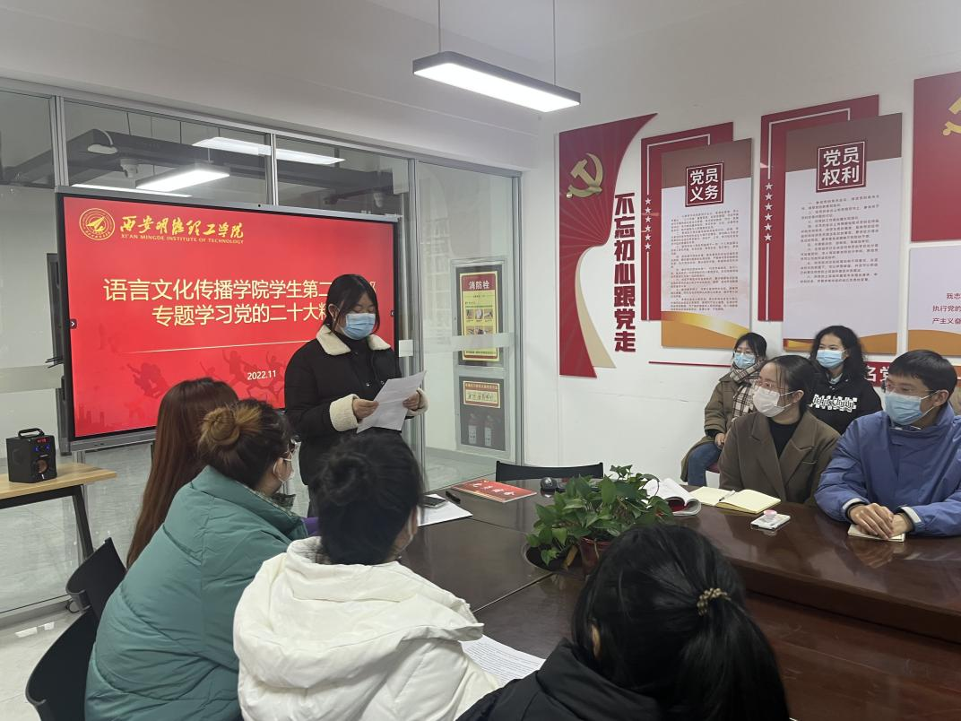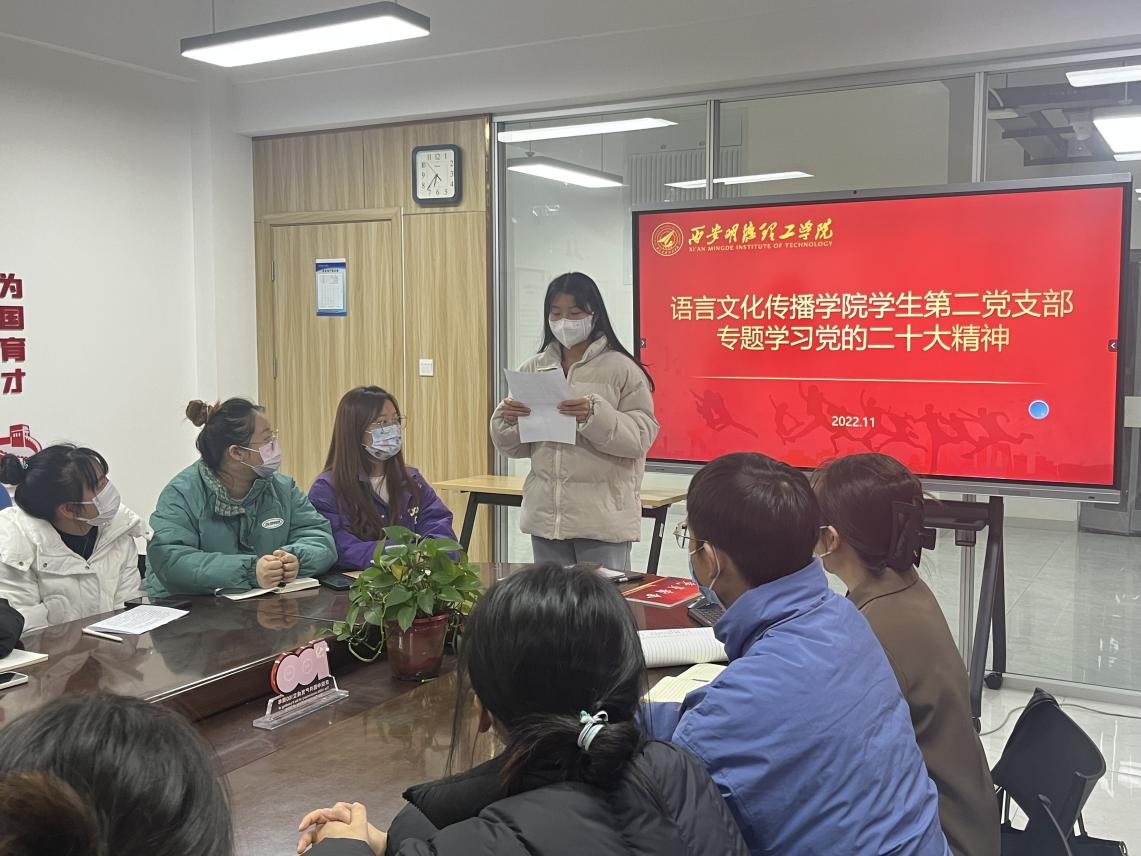 11月24日,语言文化传播学院学生第二党支部在明志楼406会议室召开党员大会,专题学习党的二十大精神。学生党支部全体同志参加学习。会议由党支部书记侯澄主持。