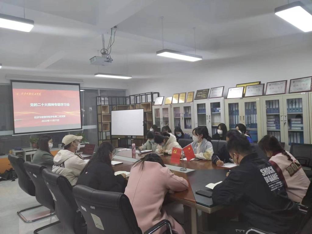 经济与管理学院学生第二党支部于11月21日下午在明志楼北507召开党的二十大精神专题学习会。会议采用线上线下相结合的方式进行,支部全体党员参加了学习,会议由支部书记许柔主持。