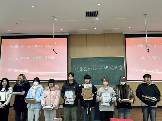 2025年1月2日颁奖典礼在庄重而热烈的氛围中举行。广告艺术专业的舒粉利老师发表了鼓舞人心的致辞,首先表示了对高职学院的大力支持表示衷心感谢,并对参赛学生们的卓越创造力给予了高度评价。随着颁奖进程的推进,一等奖、二等奖、三等奖及优秀奖的获奖名单逐一揭晓,获奖者们满怀喜悦地走上领奖台,从专业教师手中接过荣誉证书和丰厚奖品。这一时刻,是对他们个人才华和辛勤努力的最好肯定。