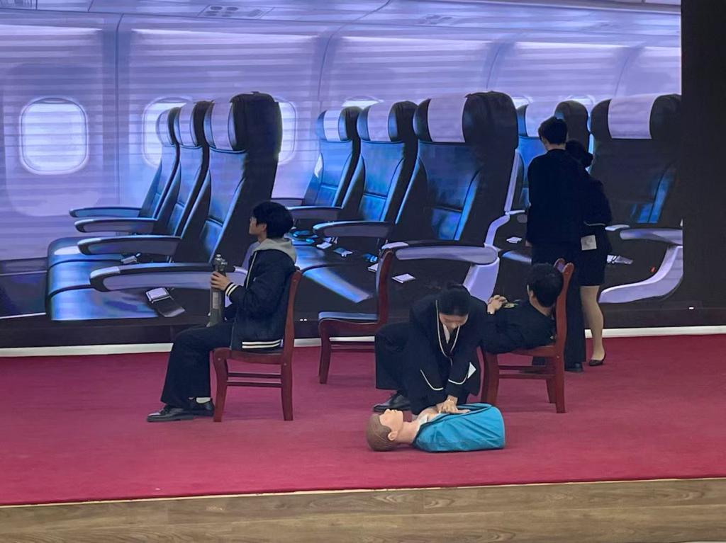 情景模拟环节则紧扣实践需求,通过还原空乘服务中的常见场景与突发状况,考验选手的应急应变、沟通协调与服务意识。无论是面对“特殊旅客”的细致关怀,还是应对“突发情况”的沉着处置,选手们均以专业姿态从容应对,展现出扎实的职业基础与良好的心理素质。评委团对这一环节的设计给予肯定,认为其真正实现了 “以赛促练”,让学子在模拟实战中提升职业能力。