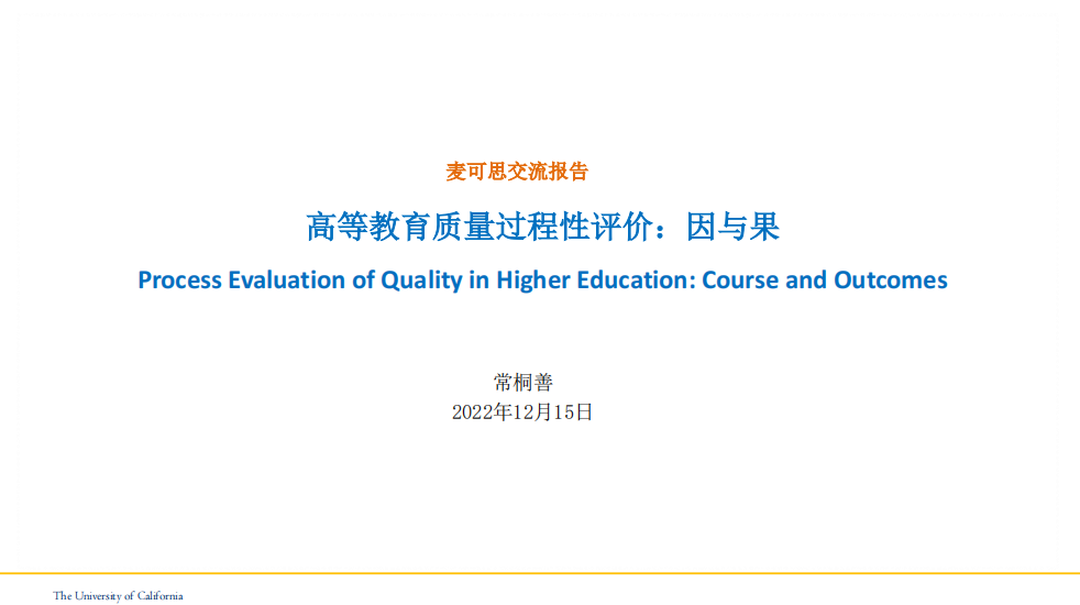 12月15日,质量管理与评估办公室组织10位校级教学督导在线上参加了由麦可思公司组织的“高等教育质量过程性评价:因与果”主题讲座。讲座邀请加州大学校长办公室院校研究与学术规划主任常桐善博士进行分享,报告主要结合加州大学系统院校研究工作经验和实践案例,介绍高等教育质量过程性评价的相关概念、重要意义及实践路径。