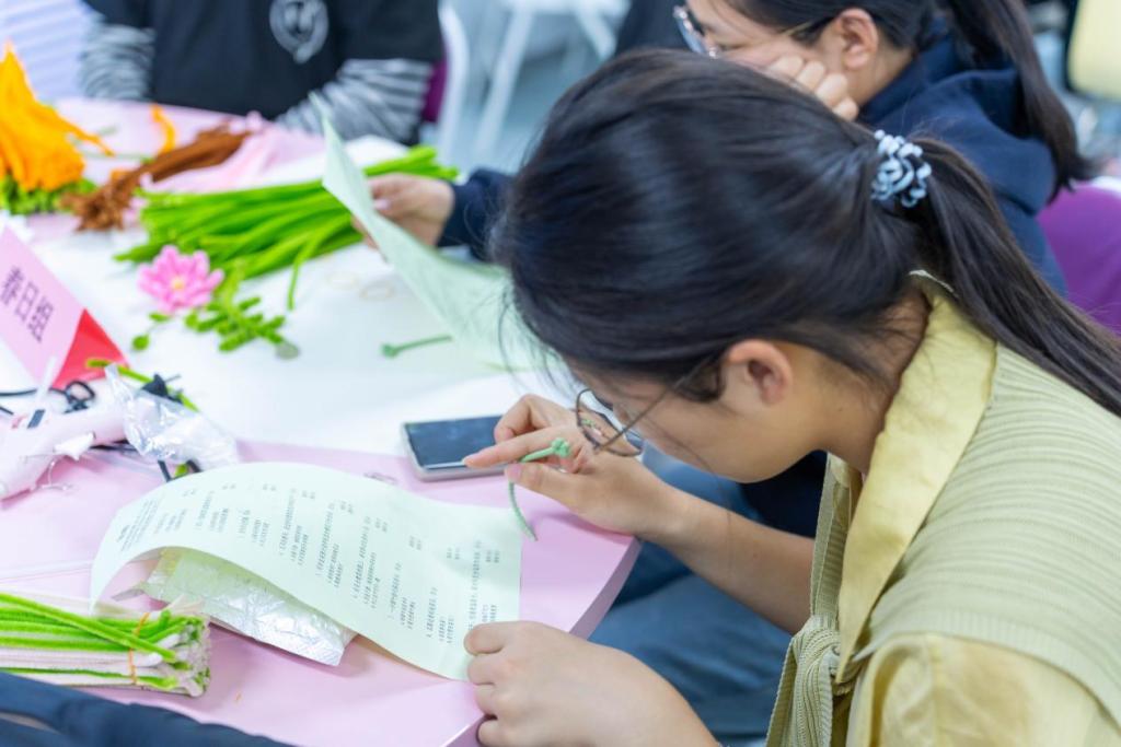 信息工程学院的8名学生化身教学扭扭棒的“花花使者”,为现场同学送去真挚祝福。在“花花使者”的悉心指导下,同学们按照“玫瑰组”“思念组”“愿望组”“烦恼组”“春日组”投入到手工创作中。一根根五彩斑斓的扭扭棒在大家手中翻转、变形,藏着心事的花蕊纸团,逐渐化作一朵朵绚丽绽放的花朵,承载着同学们的情感与希望。活动尾声,同学们纷纷合影留念,用镜头定格这一美好而难忘的瞬间。