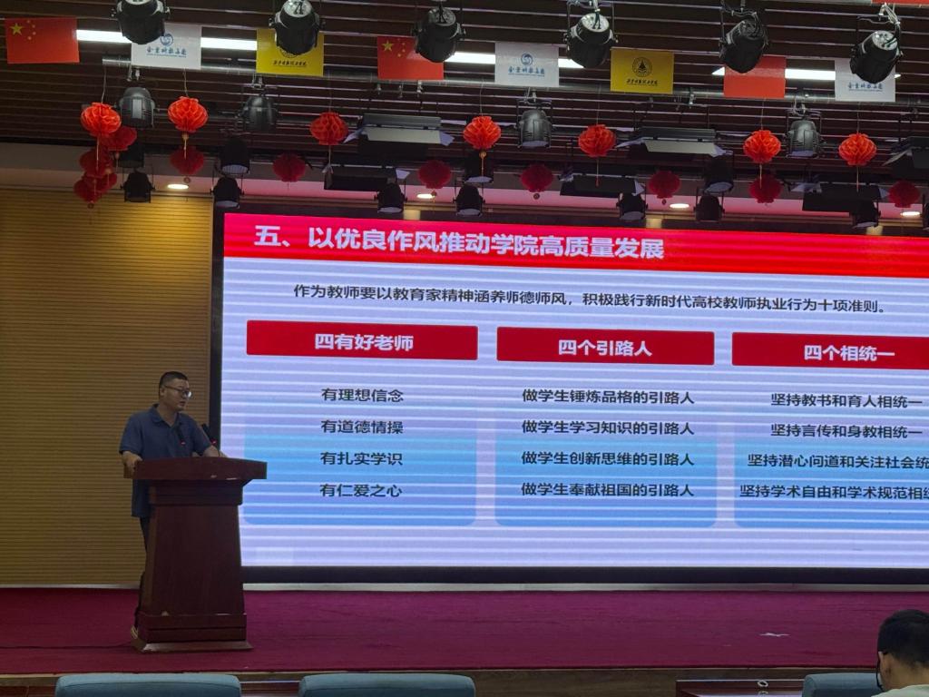 为推动深入贯彻中央八项规定精神学习教育走深走实,进一步转变工作作风,以教育家精神涵养师德师风,求真务实、担当作为,为学校高质量发展和教学评建工作贡献力量。马克思主义学院与通识教育学院党委于6月26日上午在建德楼203报告厅召开深入贯彻中央八项规定精神学习教育专题党课。此次党课以“深刻领悟中央八项规定精神 求真务实推动学院高质量发展”为主题,由党委书记王君涛主讲,全体教职工参会学习。